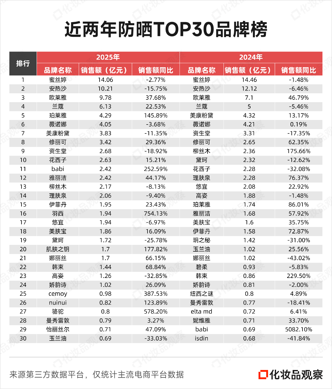 《化妆品观察》基于第三方平台数据,制得《近两年防晒TOP30品牌榜》。榜单显示,头部品牌地位稳固,蜜丝婷、安热沙、欧莱雅牢牢占据前三位置;与此同时,多个品牌实现爆发式增长,如羽西、骆驼等品牌在2025年的涨幅均超过500%。